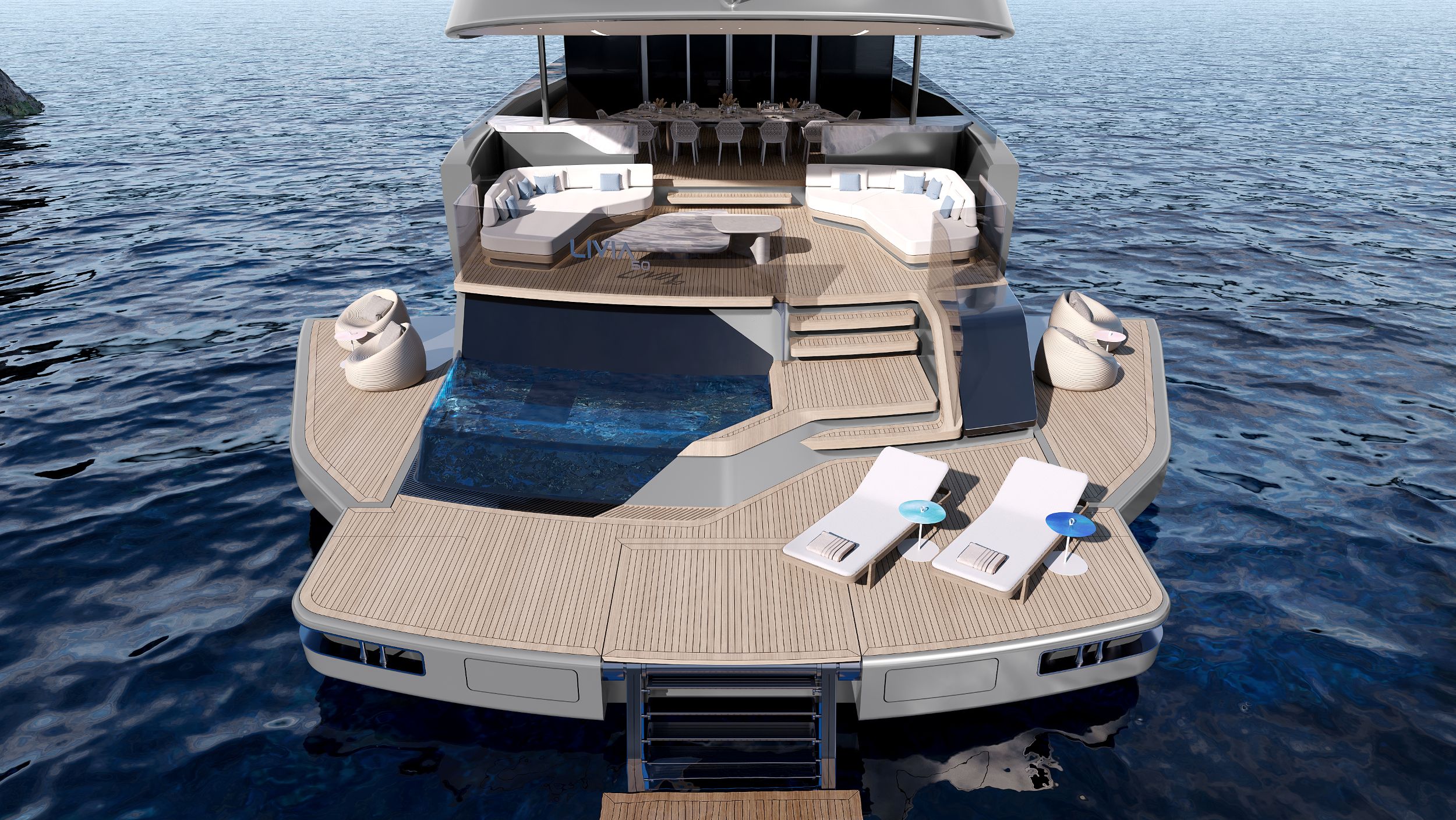 The LIVIA 50, designed under 500 GT, distills the same DNA of fluid design and sustainable luxury into a more approachable package. Its efficient layout maximizes comfort for families and friends, while maintaining streamlined operational requirements that appeal to a broader spectrum of owners. Both models carry forward LIVIA’s iconic flowing exterior lines, refined to harmonize the different proportions. Interiors emphasize sustainability with responsibly sourced materials, lighter tones, and organic textures shaping a timeless, calming aesthetic aligned with contemporary values.