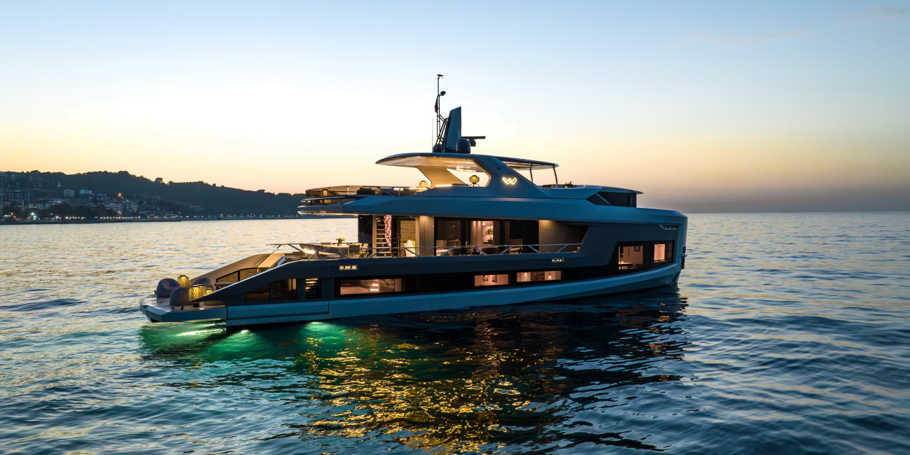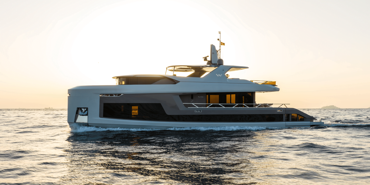 The Crossover-style exterior profile by Red Yacht Design features a raised pilothouse positioned forward in order to maximize the interior volumes. The dramatic vertical bow adds visual impact and increases the waterline length. The two-tone hull design introduces a striking new aesthetic.