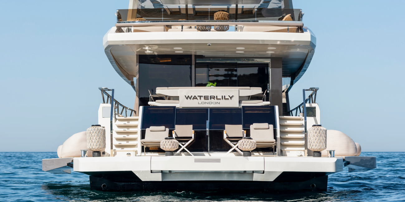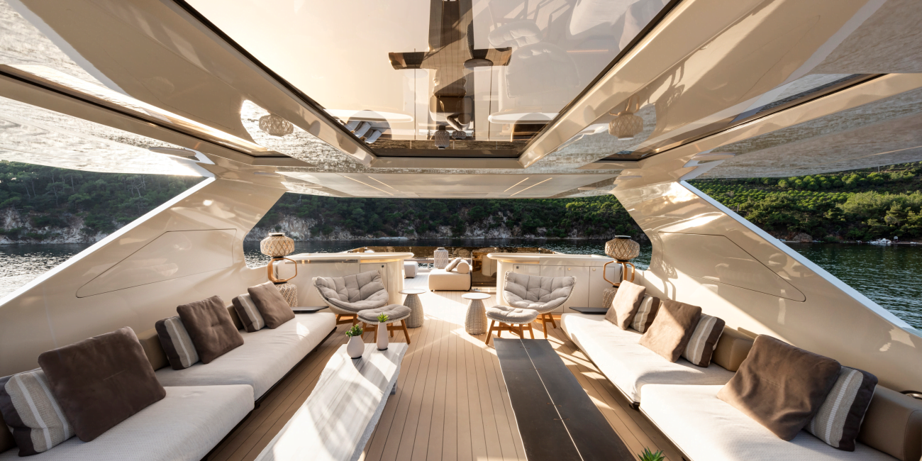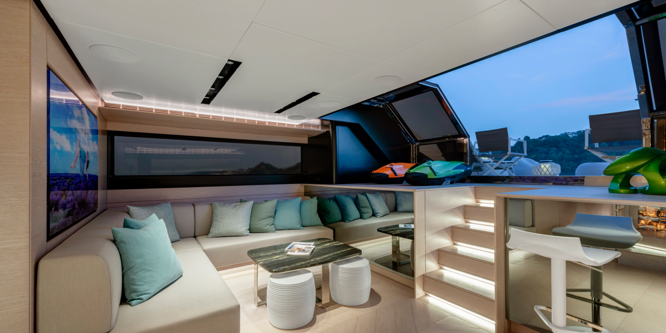 Glass sliding transom doors lead into a relaxing beach club area with a bar that can be arranged according to client preference (there is also interior access from the main salon). Forward are two twin-single guest cabins and a full-beam VIP suite. There is more lounging space, as well as dining facilities and the exterior helm station shaded by the hardtop on the fly deck.