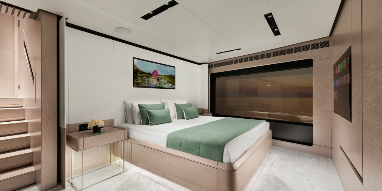 The owner’s suite in Red Yacht Design vision is located in the widebody section of the main deck forward with a bathroom in the bow. The walk-around section of the superstructure houses the main salon illuminated by full-height windows and the galley. There is al fresco dining for a full complement of 8 guests and sun loungers on the open aft deck. Stairs on both sides lead down to a very large swim platform with room for stowing a tender and Jet Ski while underway. The bulwarks fold down on either side to increase the platform area.